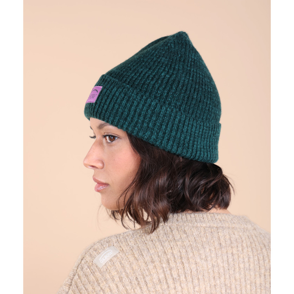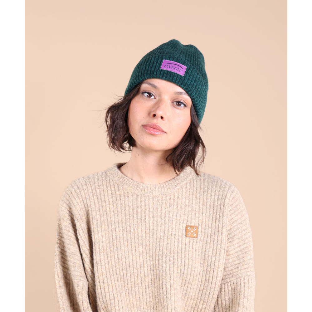 Bonnet uni à revers avec étiquette contrastée, en maille douce et extensible.